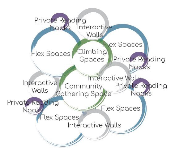 The design is meant to encourage physical activity throughout the day outside the classroom which improves the student’s concentration, improves their motivation and engagement, and improves their overall performance. The stairs are located in the center of the building so that students are continually going up and down the stairs throughout the day. The hallways are designed so that students have the opportunity to climb on the built-in furniture between classes.